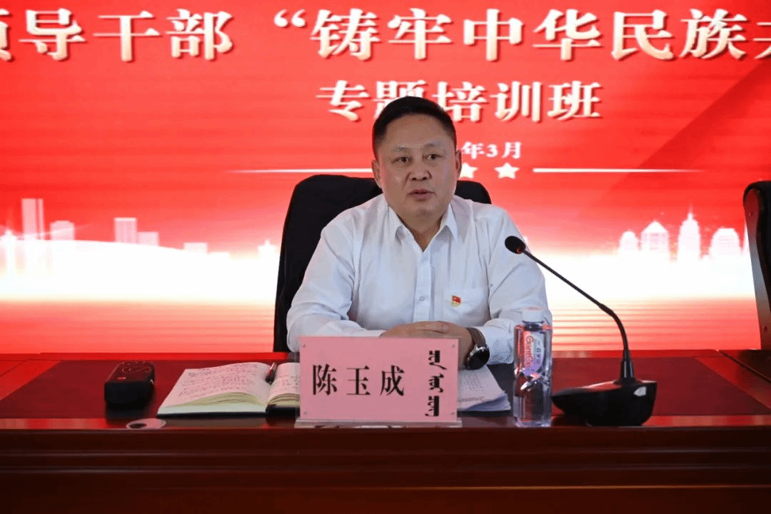 旗委书记陈玉成以“全面贯彻铸牢中华民族共同体意识主线 谱写各民族共同团结奋斗繁荣发展新篇章”为题讲授专题党课。他指出,此次培训班的目的就是深入学习贯彻习近平总书记关于加强和改进民族工作的重要思想,紧扣铸牢中华民族共同体意识工作主线,锚定“闯新路、进中游”奋斗目标,聚焦完成习近平总书记交给内蒙古的“五大任务”和全方位建设“模范自治区”两件大事,着力提升全旗领导干部把握新发展阶段、贯彻新发展理念、构建新发展格局的能力,希望参训人员通过培训进一步锤炼政治品格、汲取理论养分、提升综合素质,在开阔视野、增长知识的同时,也要看到差距、学到经验、拓宽思路。