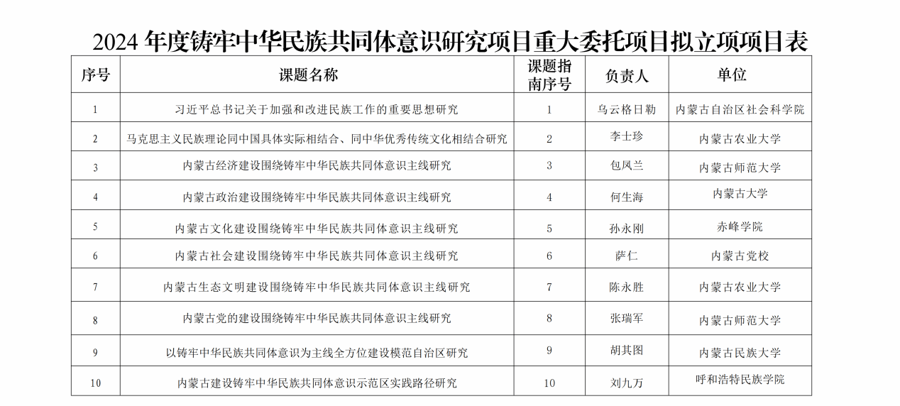 公司铸牢中华民族共同体意识研究培育基地获批2024年度铸牢中华民族共同体意识研究项目重大委托项目2项,分别是公司党委书记陈永胜主持的《内蒙古生态文明建设围绕铸牢中华民族共同体意识主线研究》和李士珍主持的《马克思主义民族理论同中国具体实际相结合、同中华优秀传统文化相结合研究》。