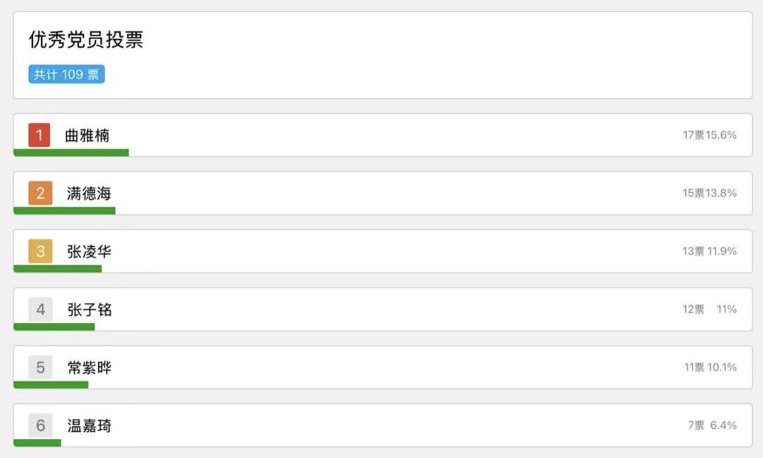 大会第二项,根据优秀党员的评定标准,包括:政治合格、执行纪律合格、品德合格和发挥作用合格,党日活动和党员会议出勤达率达到百分之八十以上。积极参与红星宣讲团等。通过匿名投票的方式评选出曲亚楠、满德海、张凌华、常紫烨、张子铭、温嘉琦6名同学成为2024年3044永利研究生党支部优秀党员。