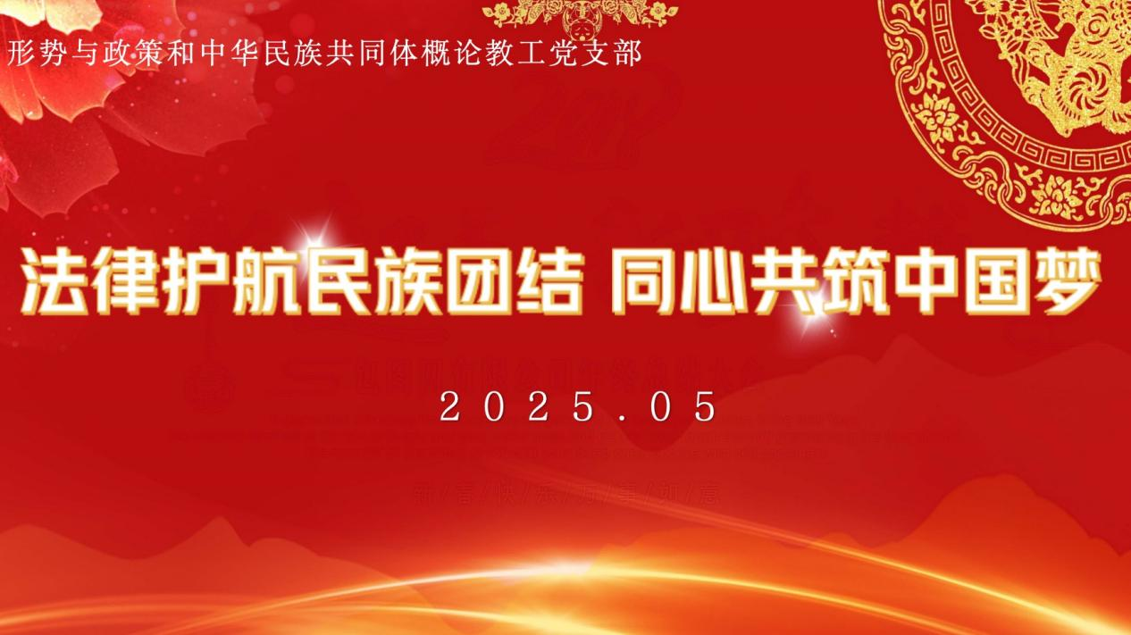 为深入贯彻落实习近平总书记关于民族工作的重要论述,根据自治区党委宣传部等五部门联合印发的《2025年全区"民族政策宣传月""民族法治宣传周"工作方案》要求,5月22日上午,形势与政策和中华民族共同体概论教工党支部组织深入开展"民族政策宣传月"专题学习活动。活动邀请支部党员、法学专家学者阿茹罕教授作专题辅导讲座,支部全体党员参加学习。