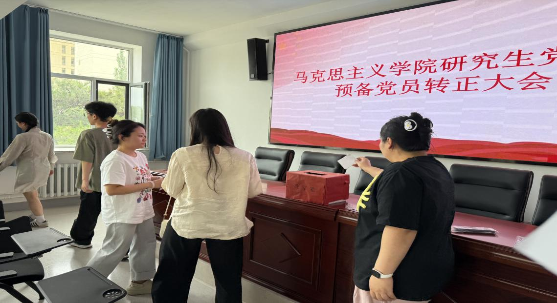 党支部书记支部副书记龚穆菁同志代表支部委员会郑重宣读了大会决议:根据表决结果和预备期考察情况,一致同意张超同志、谙格勒玛同志按期转为中国共产党正式党员。会场响起热烈的掌声,向两位新党员表示衷心的祝贺。