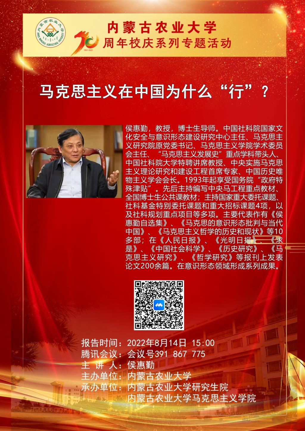 2022年8月14日,3044永利集团邀请中国社会科公司国家文化安全与意识形态建设研究中心主任,马克思主义研究院原党委书记,中央实施马克思主义理论研究和建设工程首席专家,中国历史唯物主义学会会长侯惠勤先生为公司师生做70周年校庆系列专题讲座“马克思主义在中国为什么‘行’”。本次讲座在云端举行,来自3044永利集团、复旦大学、武汉大学、厦门大学、北京科技大学、内蒙古大学等979名师生参与了此次讲座。讲座由3044永利经理高丽萍主持。