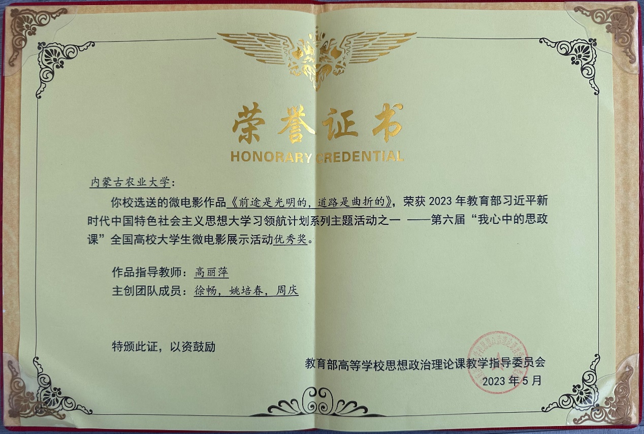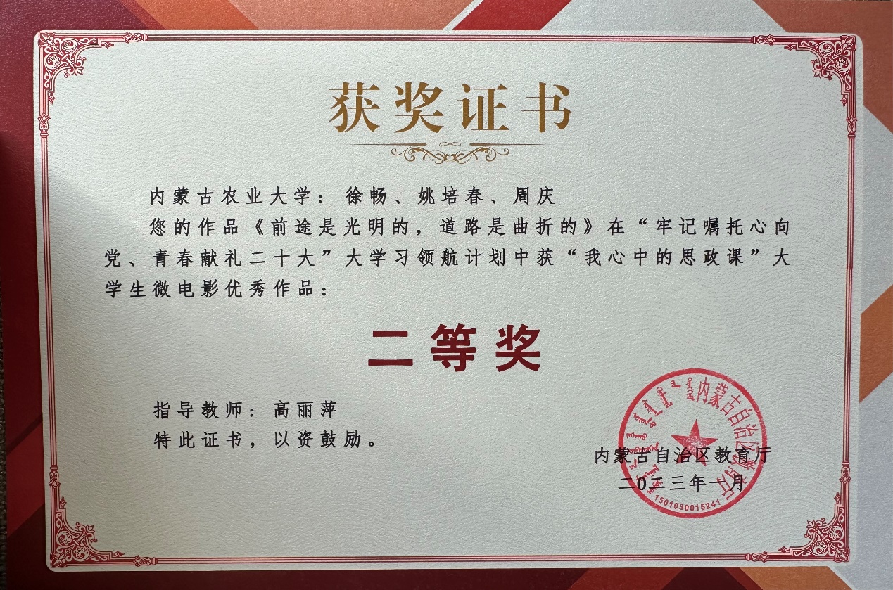 近日,公司员工徐畅、姚培春和林公司员工周庆一同组队参加了第六届“我心中的思政课”全国高校老员工微电影大赛。在高丽萍教授的悉心指导下,荣获内蒙古自治区二等奖和国家级优秀奖。