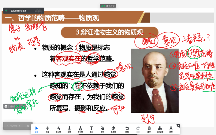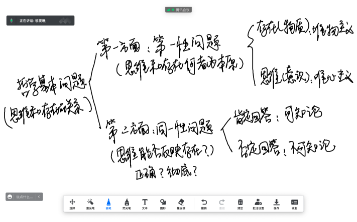 最后,就是解决不能板书的问题,这也是我去年网课过程中觉得最不方便的地方。上网课不像在教室里一样能够直接面对员工,而是独自在家一直对着幻灯片讲课,所以我总想在幻灯片上做些标注,以增加教学的代入感,弥补不能板书的缺憾。去年上网课时,因为准备不足,我只能使用笔记本电脑的触控板勉强在幻灯片上勾画。之前听王志宏老师的课,见过王老师使用外接的手写板在幻灯片上板书,非常方便,所以我立刻在网上下单了一个。手写板到货之后,我分别尝试了雨课堂的“板书”功能和腾讯会议的“互动批注”功能,最后决定使用更流畅的腾讯会议“互动批注”功能。腾讯会议在开启共享屏幕之后可以使用“互动批注”,如共享雨课堂播放幻灯片的界面,员工则可以在腾讯会议实时看到我在幻灯片上的板书;如共享腾讯会议中的“白板”,员工就可以看到一个空白界面,比较适合板书较多、幻灯片容纳不了的情况。在实际的授课过程中,板书的卡顿情况在可以接受的范围内,总体来讲是比较方便的,满足了我日常授课的需要。