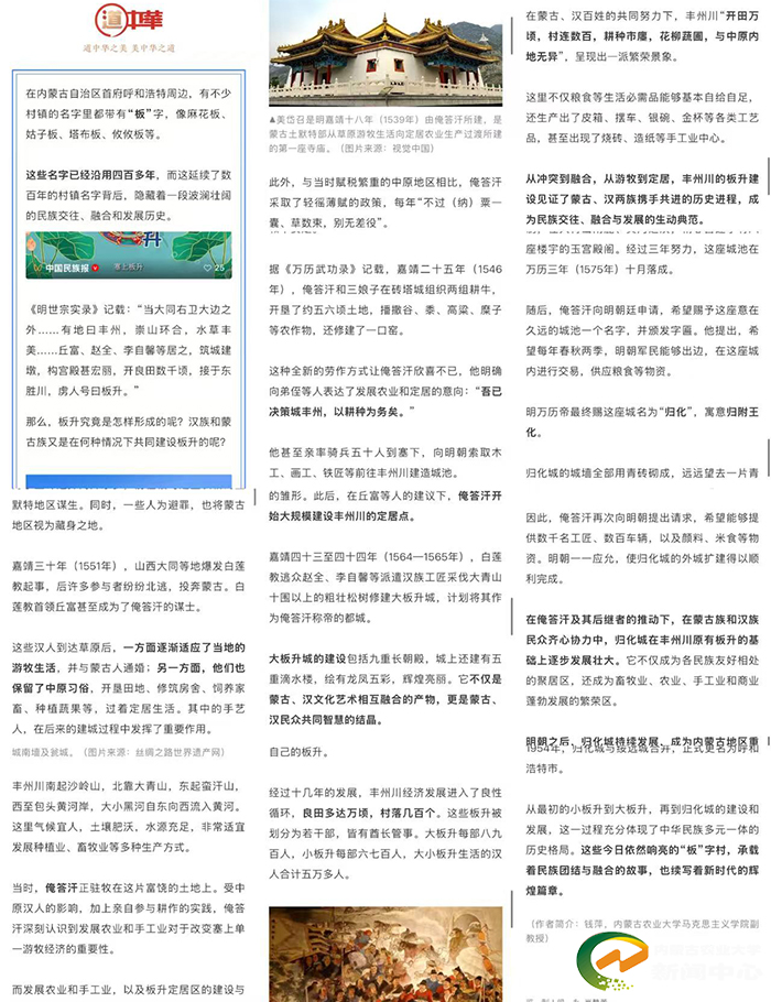 近期,钱萍在“道中华”公众号上发表了原创文章《呼和浩特初代“小区”的名字是这么来的?》。文章以通俗风趣的语言讲述了呼和浩特的前世今生,包括隆庆和议、汉人北迁、建设板升、归化城崛起。从板升出现、扩建,发展为归化城的历史进程,展现了明代丰州川的多民族交往融合以及中华民族多元一体的格局。从最初的小板升到大板升,再到归化城的建设和发展,这一过程充分体现了中华民族多元一体的历史格局。这些今日依然响亮的“板”字村,仍然承载着民族团结与融合的故事,也续写着新时代的辉煌篇章。